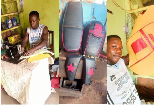 Helping a young orphan who learned a skill to get a machine and start sewing motor bike protection fabric